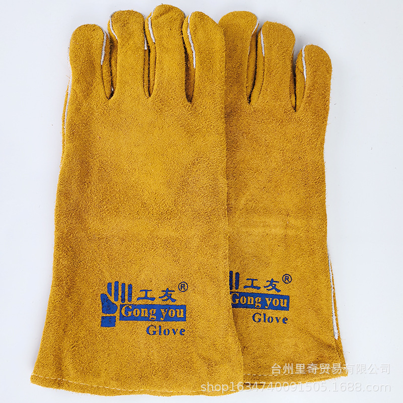 工友黄二重裏地布点溶接断熱保護電気溶接用手袋、耐摩耗性、耐熱性革手袋