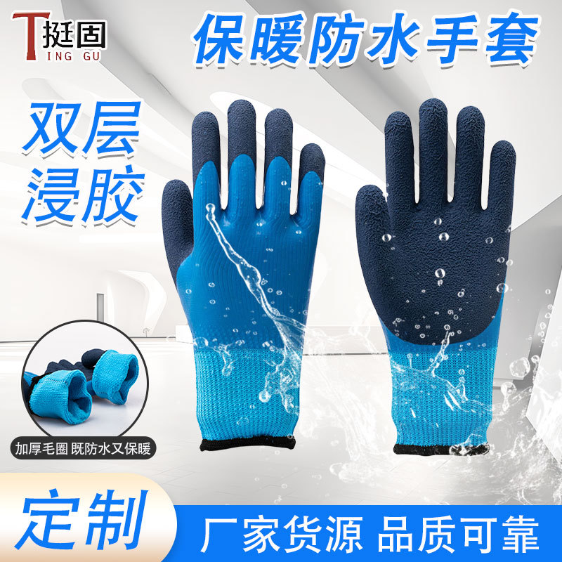 卸売開司米絨毛二重防水厚い保温手袋労働保護耐摩耗性滑り止めドライゴム手袋クロスボーダー