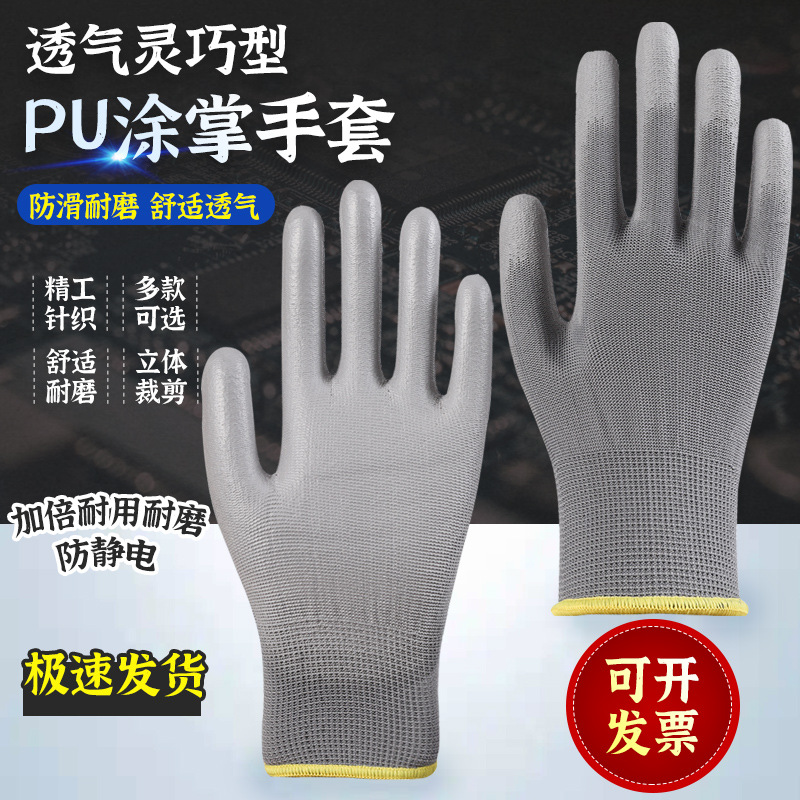 輸出グレー PU 手袋通気性ニットコーティング労働保護手袋帯電防止滑り止め通気性 PU コーティングされた手のひら手袋