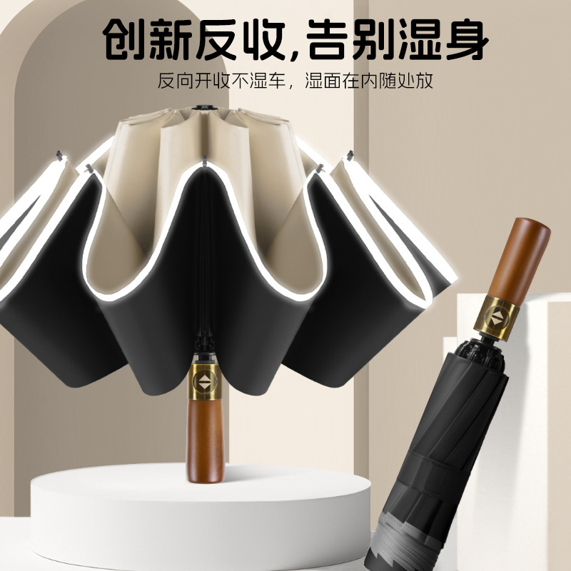 全自動実木柄傘逆傘エッジ反射ストリップ黒ゴム日焼け止め日傘男性ビジネス広告傘