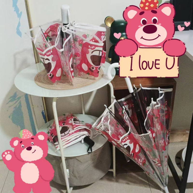 长柄ins女の子高い颜値イチゴクマ透明フルオートマチックかわいい雨伞子供手动伞学生文芸