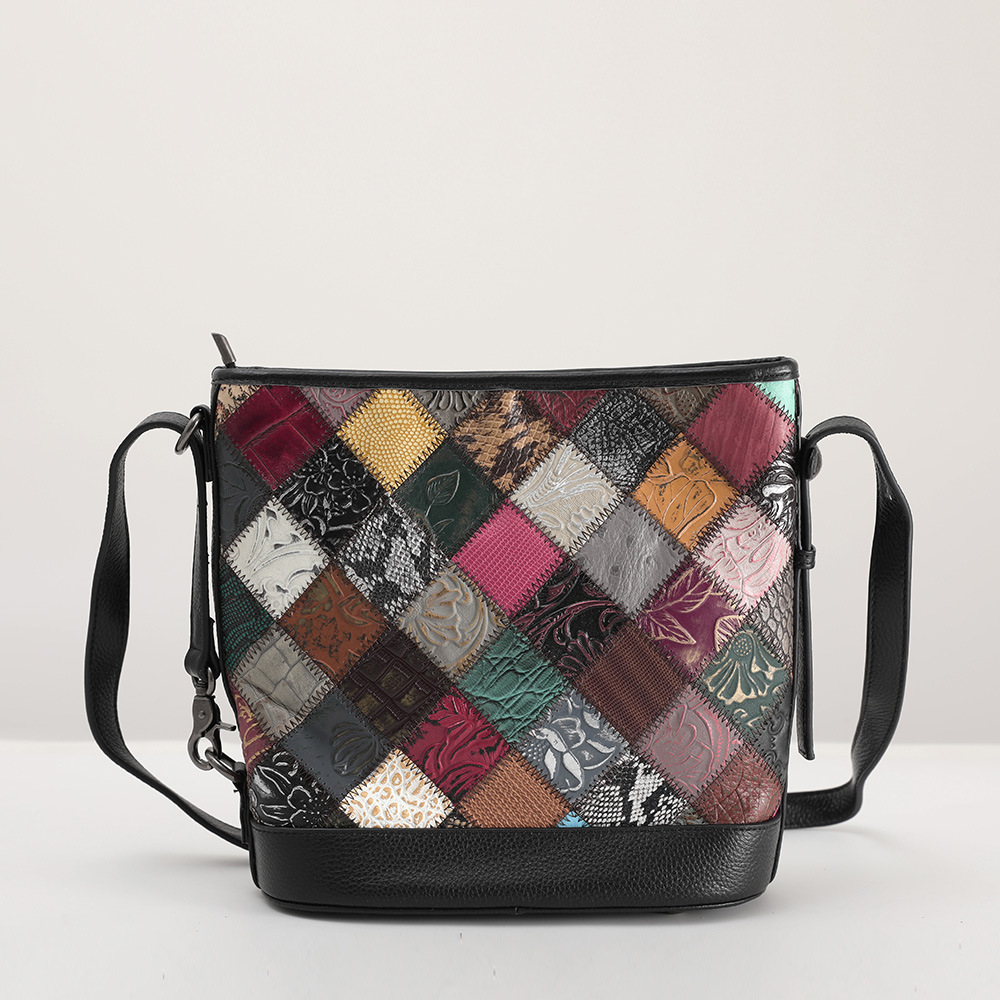 第一層牛革エスニックスタイルレディースバッグ、パーソナライズされたステッチレザーショルダーバッグ、ファッショナブルなカラフルな円筒形レディースクロスボディレザーバッグ
