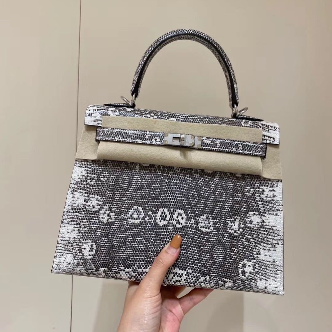 全手作り輸入本物トカゲ革紋ケリーバッグ25cm女性シングル肩斜め掛けハンドバッグ銀ボタン