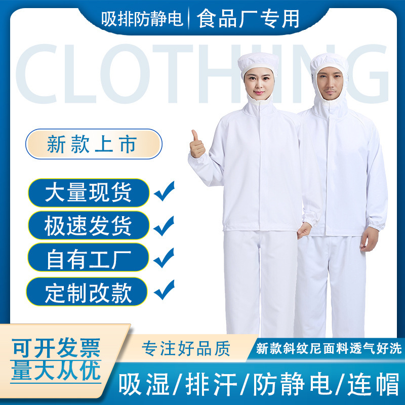 静電気防止フード付き食品工場作業服吸湿排汗セット洗濯加工工場女性長袖ロゴ
