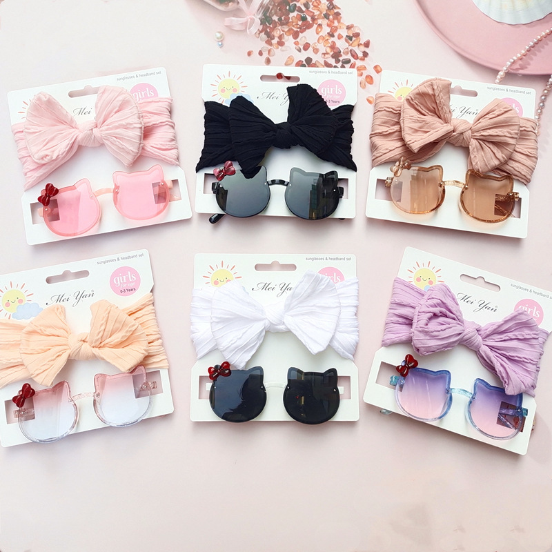 新型越境児童の頭飾りの赤ちゃんの蝶結びのナイロンの広い髪の帯の小さい王女の夏の猫のサングラスの2セット