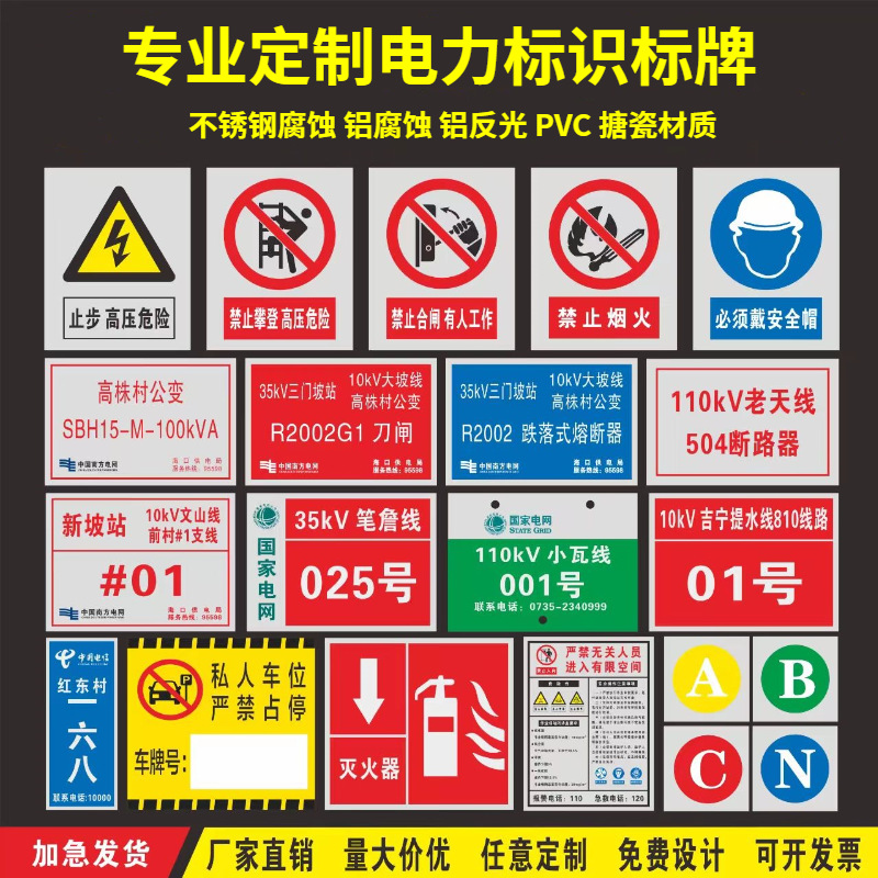 電力看板、反射アルミ看板、ワイヤーポールナンバープレート、登山禁止、交通安全警告看板、エナメル看板工場