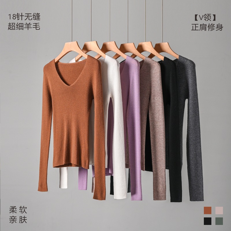 揚子紗島精18針シームレスvネック100ウールのニットの女性がスリムに見えます。