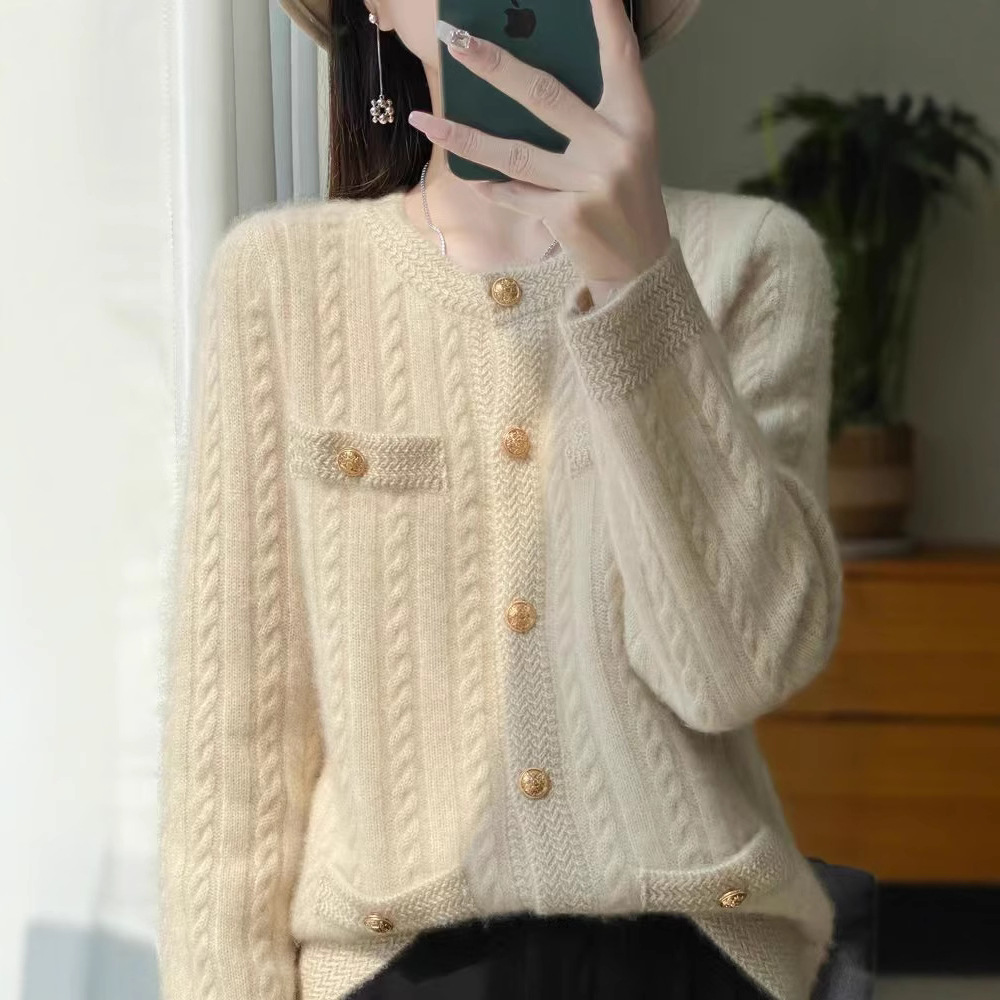 2025年秋冬季 プーヤン ローレン同風 レトロ編み込みラウンドネック レディースコート 100%羊毛ニットカーディガン
