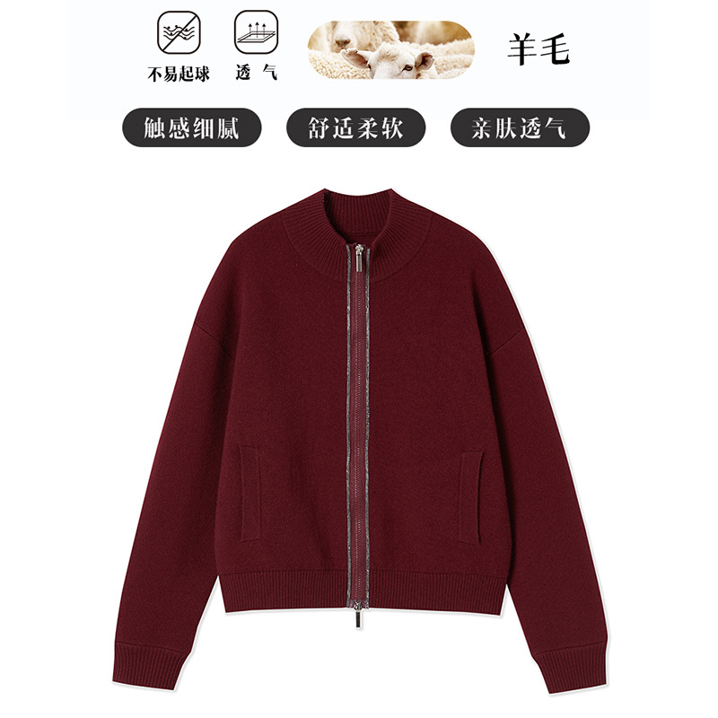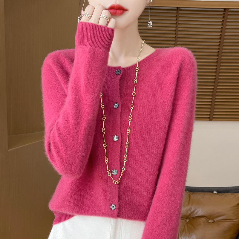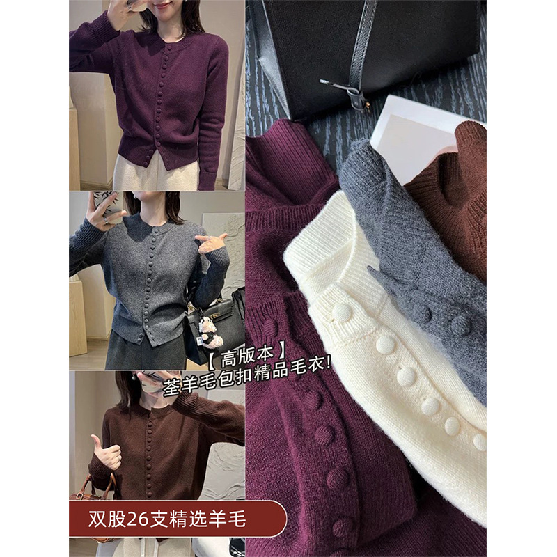 純ウール一線成衣小柄丸首メリヤスカーディガン女性2024秋冬新作純色セーターコート