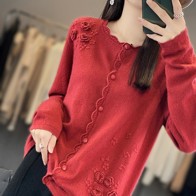 2024秋冬の新型レースの花の丸首の純ウールのカーディガンはゆったりとしていて、着痩せしています。