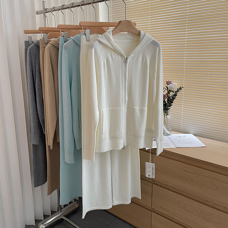 春と秋の新 LP ピュアウールセーターフード付きルーズジッパージャケット + ストレートパンツスーツ多用途年齢軽減スタイル