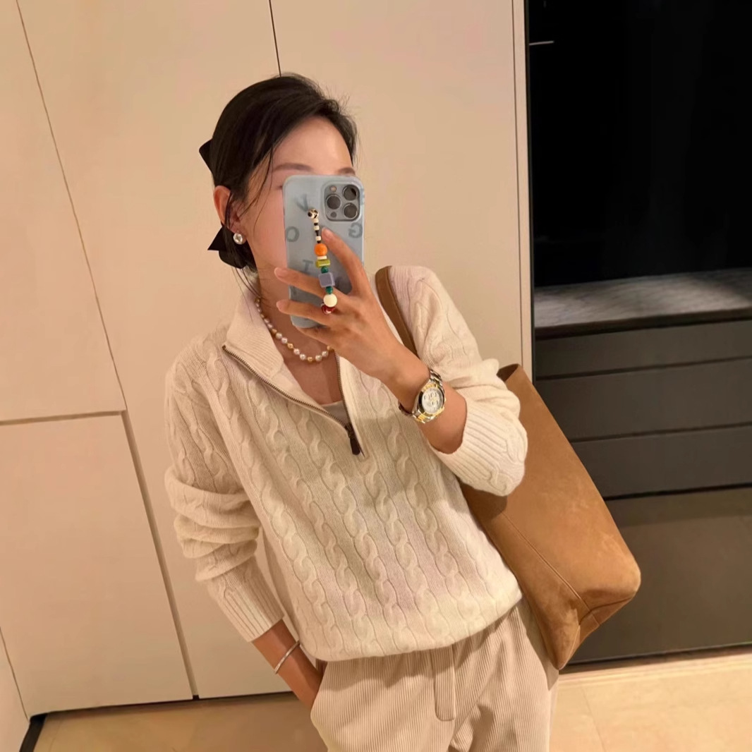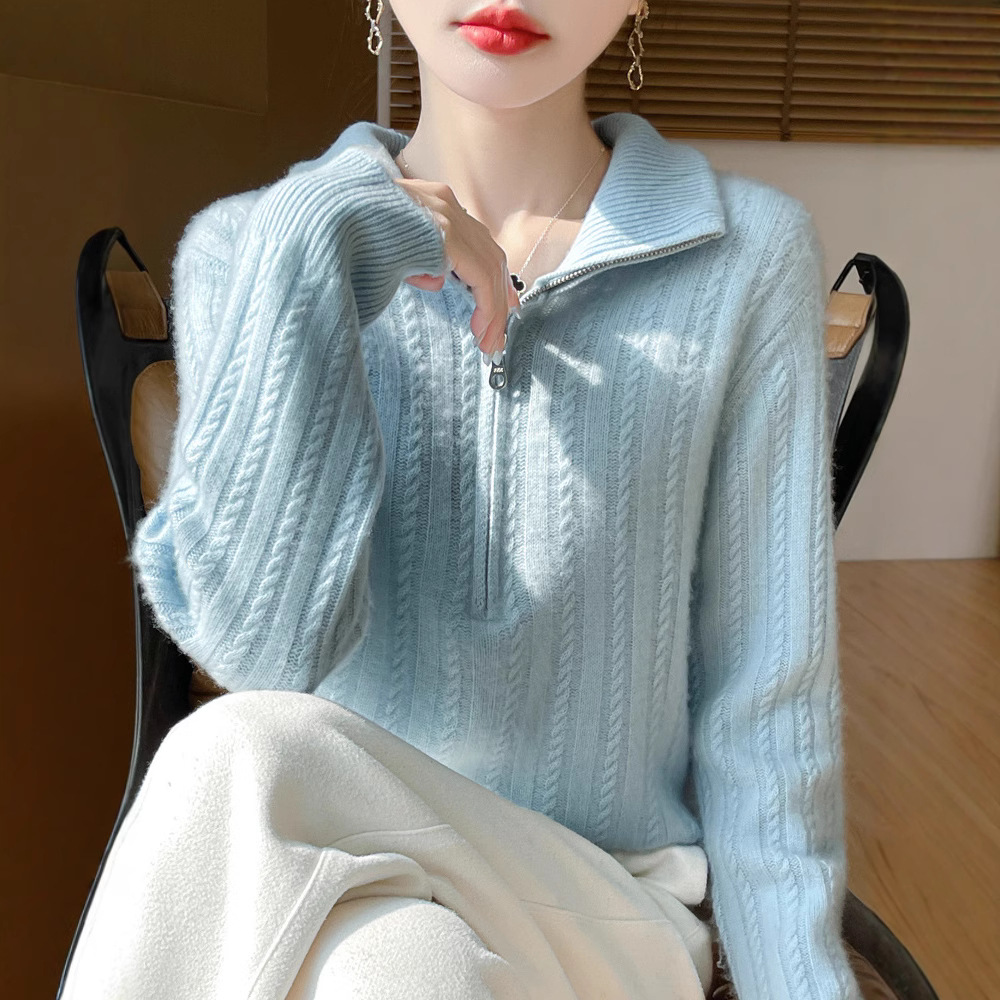 2024 秋と冬の新しいハイネック 100 ピュアウールセーター女性のためのルーズ痩身気質ツイストハーフジップセータートップ