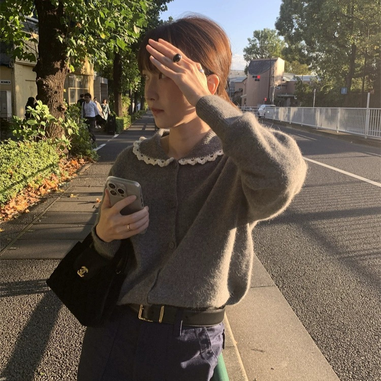 2025年冬新作 韓国東大門leobe エレガントで甘いニットカーディガン レース襟セーター レディーストップス