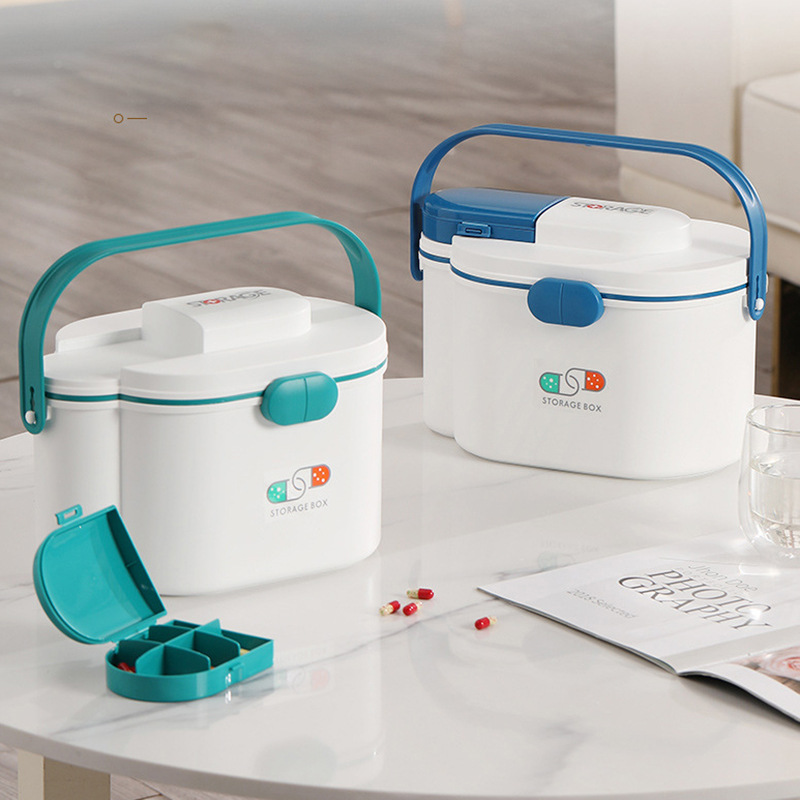 全仕切り家庭用収納手提げ小薬箱カプセルボタンプラスチック医薬箱工場の商品は国境を越えてロゴを印刷することができる