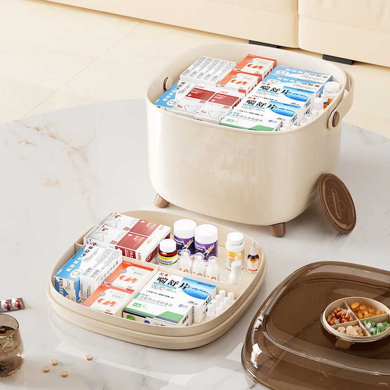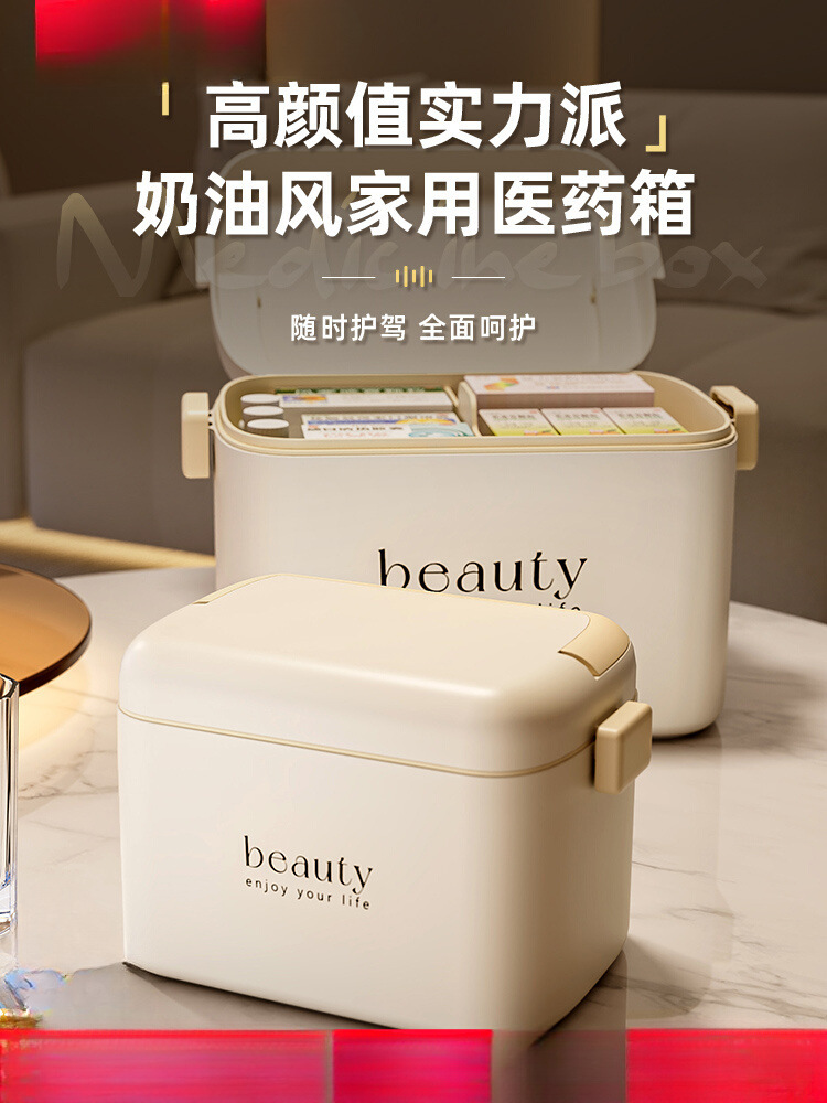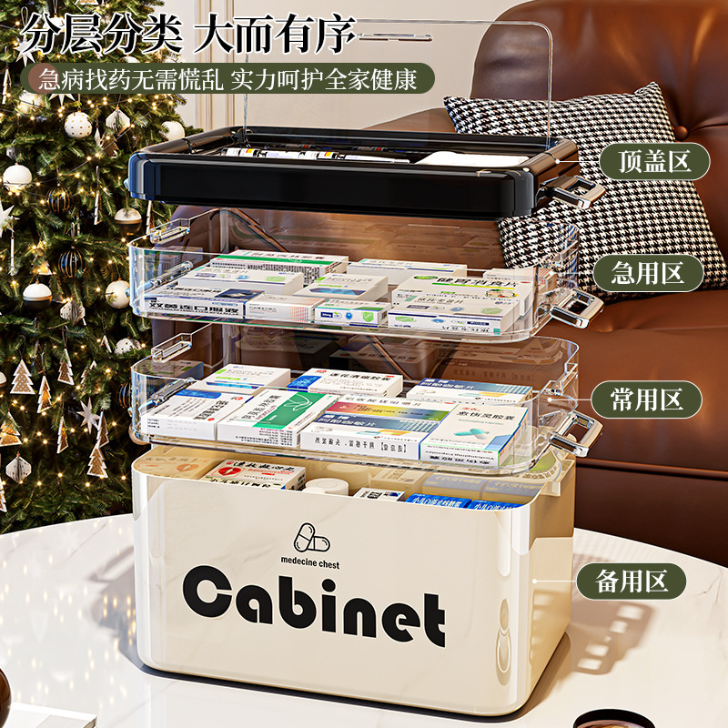 家庭用シンプルなクリーム多層薬箱多層収納ボックス医療ボックス大容量透明プラスチックハンドルリビングルーム