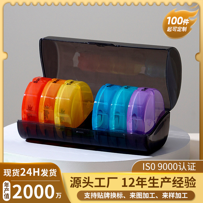 厳選された人気の丸型14コンパートメント薬箱、ポータブル旅行用1週間薬箱、カラフルな薬箱、ポータブル薬ディスペンサー