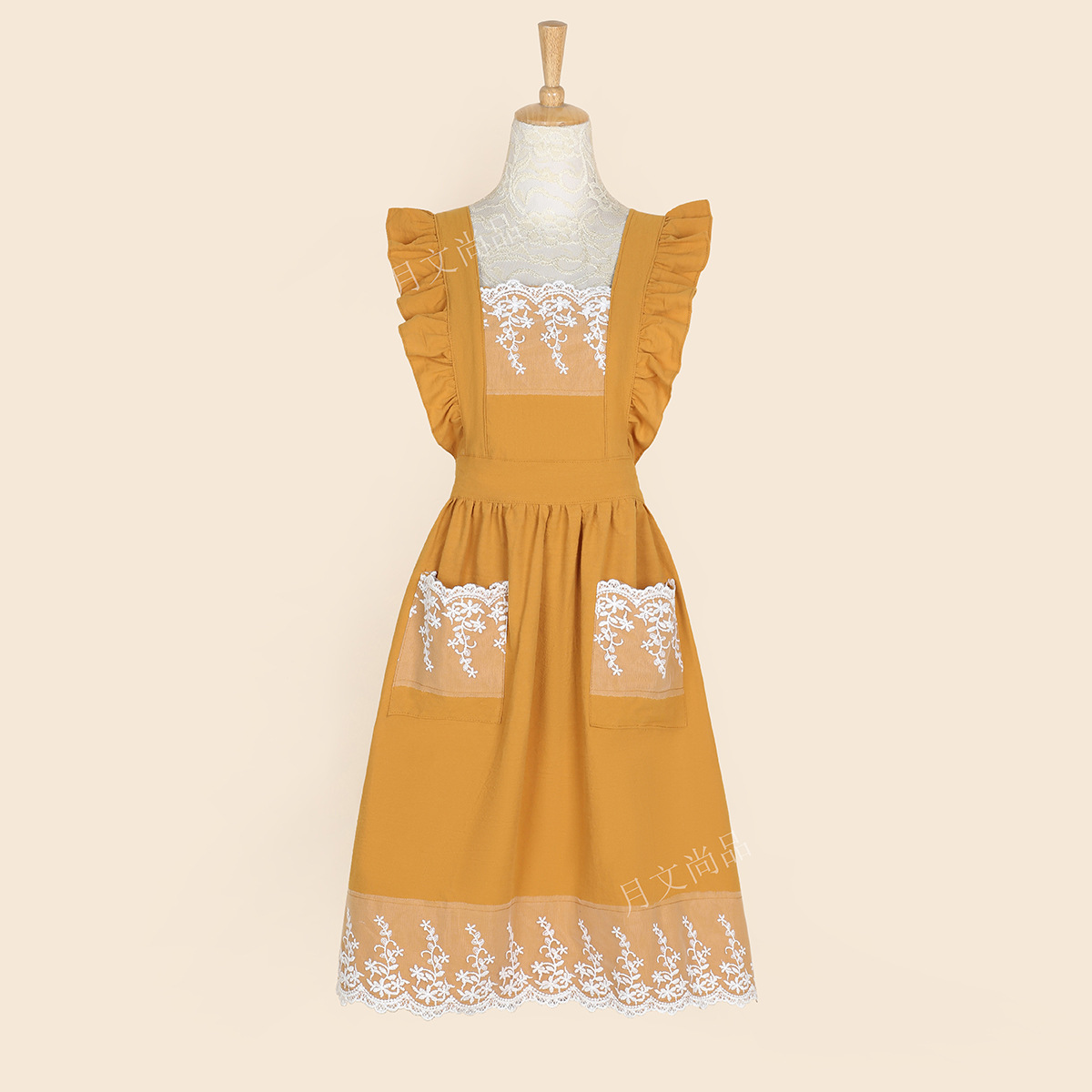 台所の防油防汚エプロン女性韓国版ファッションノースリーブレースのフリルの蝶結びが腰を囲んでいます。