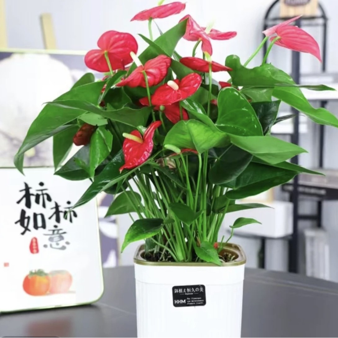 屋内でも四季を通じて育てやすい、リビングルームの水耕栽培の緑の植物、デスクの花、アンスリウム、スムーズフラワー、本物の花の鉢植え