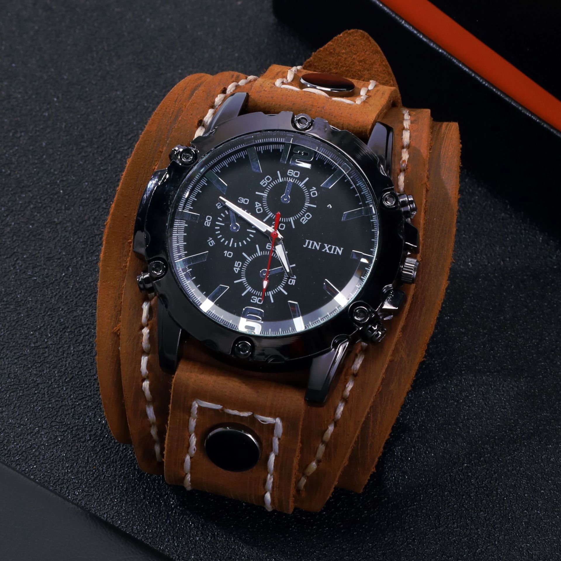 メンズ本革腕時計ビッグ 3 針クロノグラフ合金腕時計メンズクォーツ時計ヨーロッパとアメリカンスタイルのパーソナライズされた腕時計