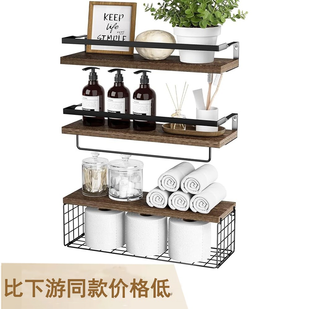 国境を越えた木製壁掛け式浮遊棚浴室壁の多層浮遊仕切り板棚木製トイレ紙付き収納バスケット