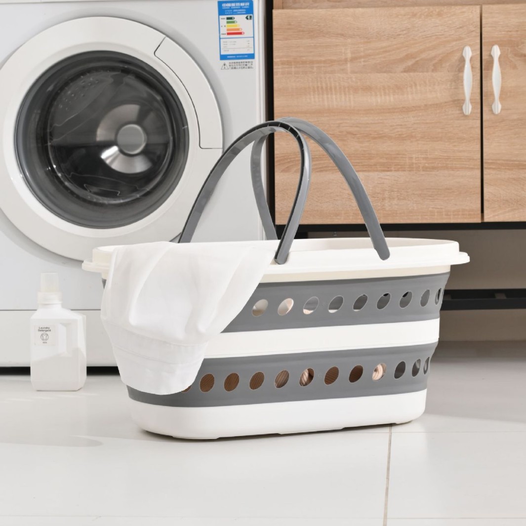 洗濯かごを折りたたみます。寝室のトイレは洗濯物を洗濯します。