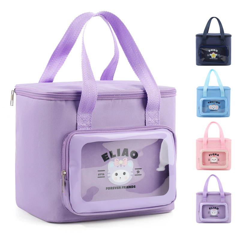 新しいキャンディーカラーの学生ランチバッグ、米食事バッグ、正方形のランチバッグ、透明なフロントポケット、痛いバッグ、ランチボックスバッグ