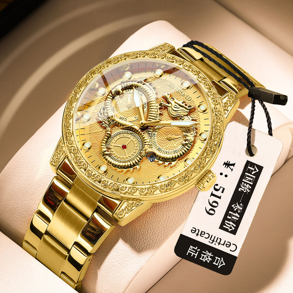 BINBOND龍時計クロスボーダー爆金金色レリーフ男性腕時計男性三眼龍夜光防水石英時計