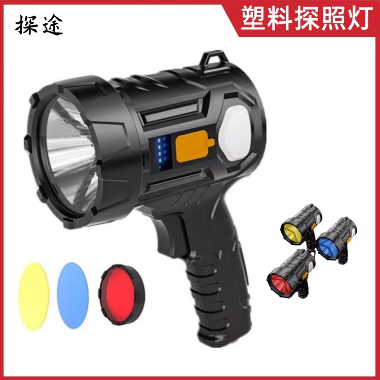 屋外LED強光懐中電灯充電携帯長航続遠射サーチライトサイドライト付き赤青フラッシュ警告灯
