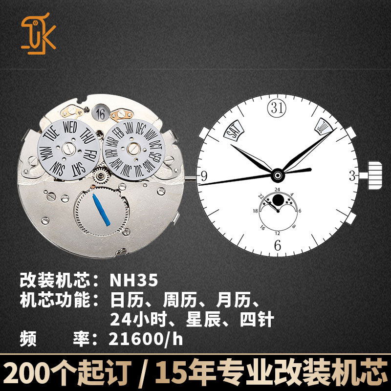 ODMカスタマイズされたnh35ムーブメントモジュール設計と複雑な機能カレンダー月カレンダー星4針機械式ムーブメントの修正