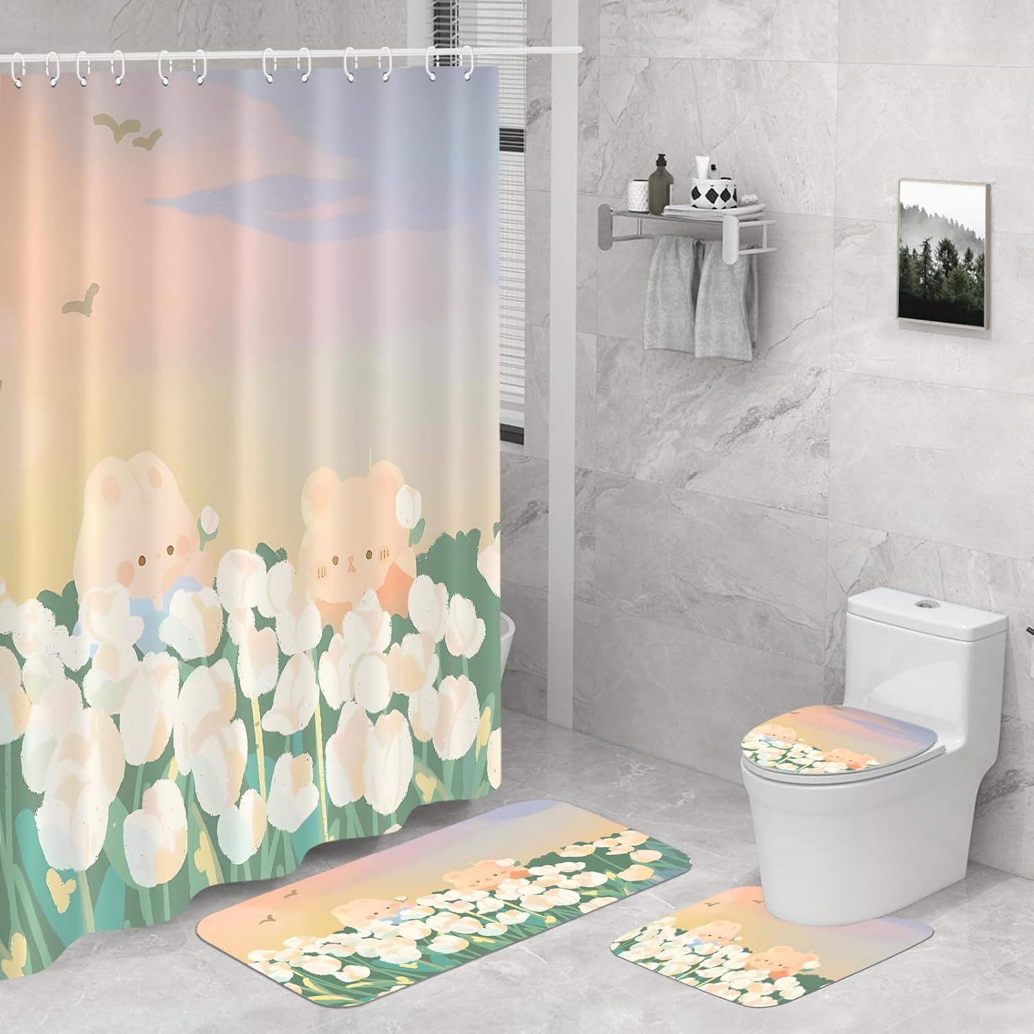 国境を越えてかわいい植物花卉アニメ熊童趣味浴室の4点セットのシャワーカーテン吸水マット