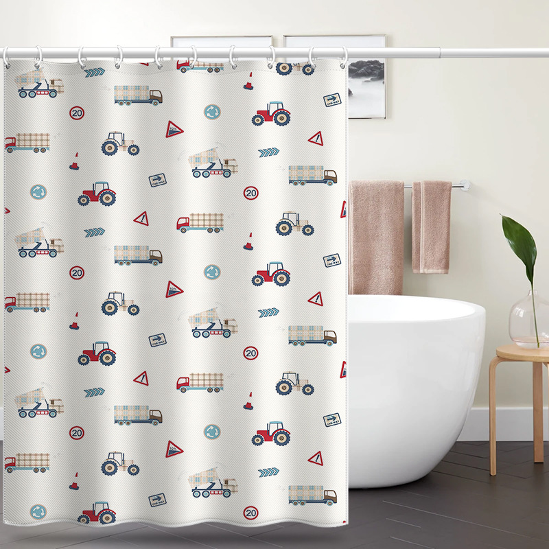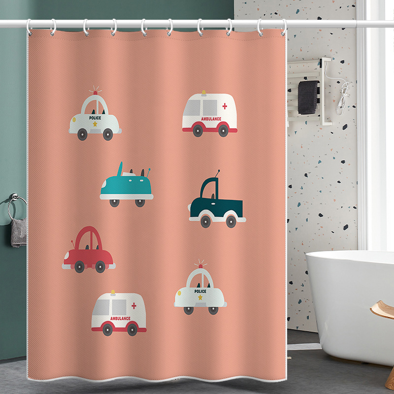 3dデジタルプリントの小さい車のシャワーカーテンは国境を越えたポリエステル防水防かびシャワーカーテンをカスタマイズします。