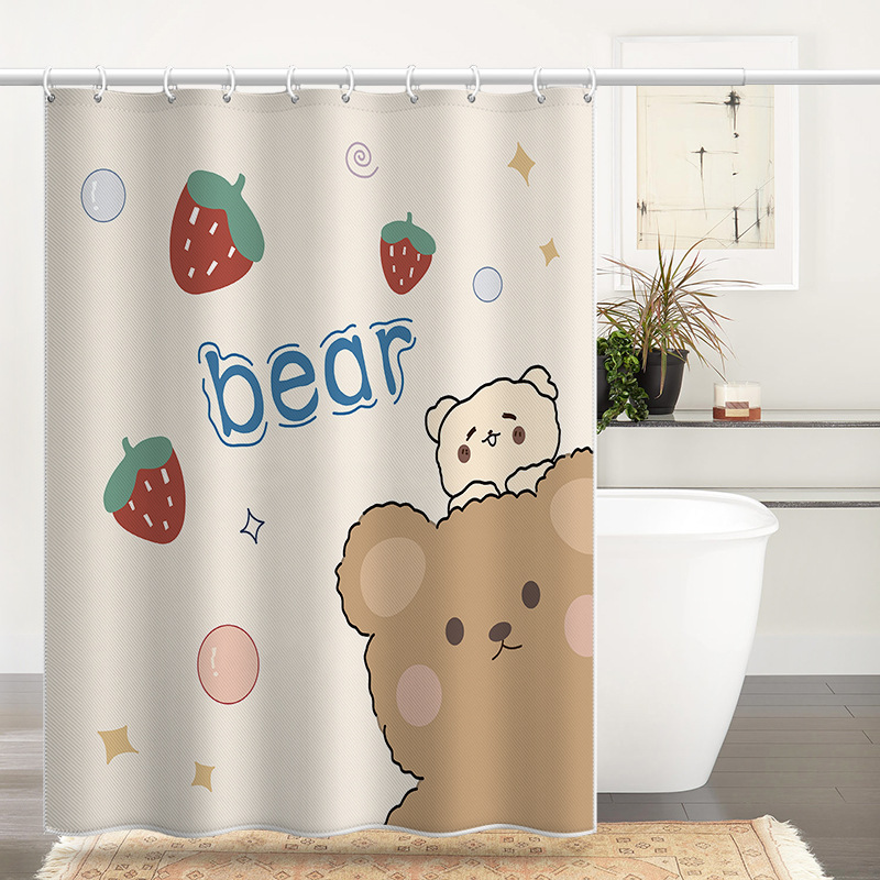 かわいいいちご熊シャワーカーテン穴を開けない防水防かびポリエステル布トイレ遮断カーテン風呂カーテン