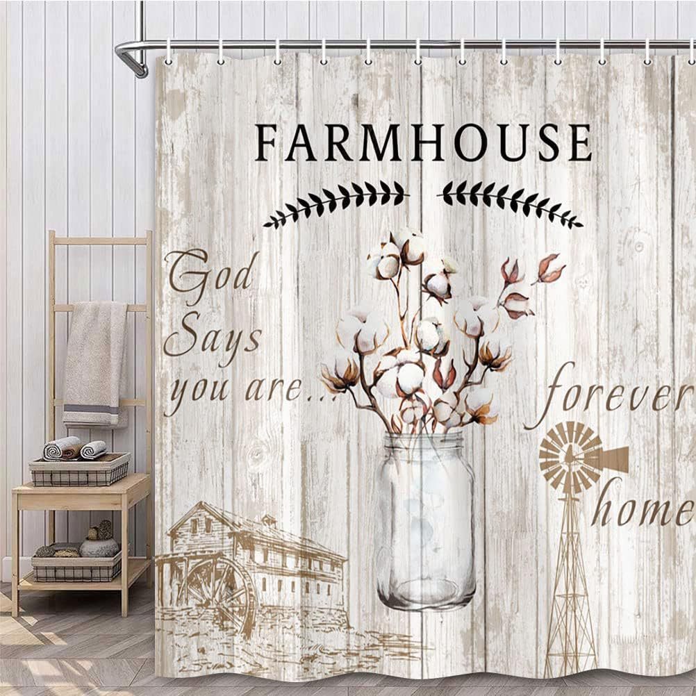 風車シャワーカーテンカントリースタイルファームハウスバスカーテン、ブルーグリーンレトロウエスタンファーム納屋バスカーテンセット防水