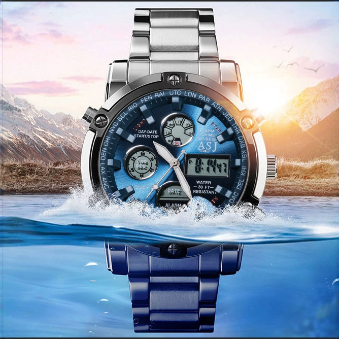 Asj外国貿易ファッションメンズ多機能電子時計シンプルビジネス防水鋼帯ダブルムーブメント電子時計
