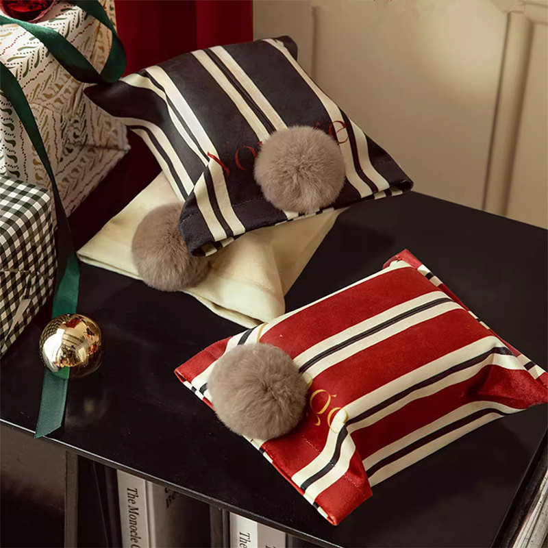 現代の軽い贅沢なシンプルなストライプの赤い新年の装飾は紙箱の客間の車の車の上で短いぬいぐるみのティッシュの箱を引き出します。