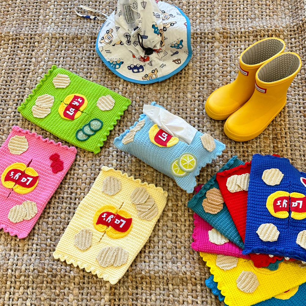 手作りの毛糸編みのアイデアポテトチップスのティッシュケースの高級感があります。