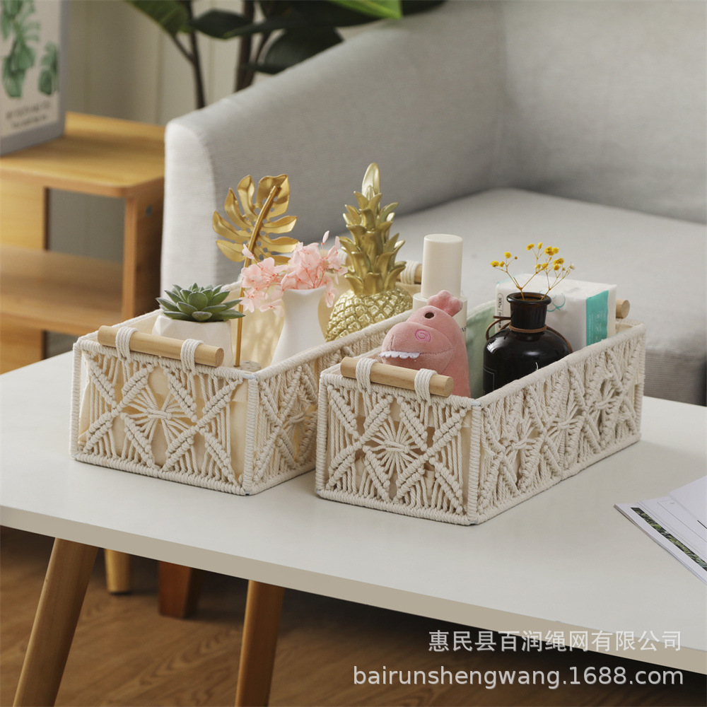 北欧風デスクトップ収納ボックス物入れ手編み綿紐フリンジティッシュペーパー小物収納整理カゴ