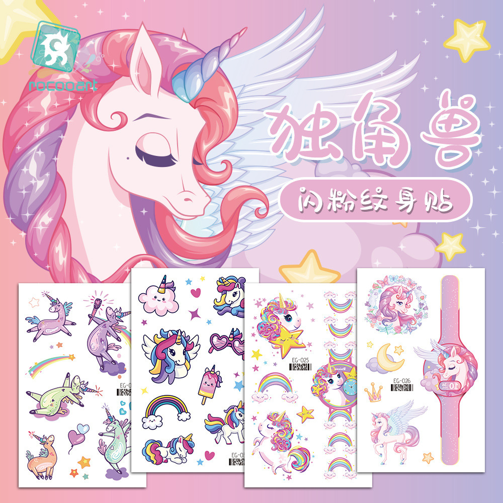 国境を越えた新しいフラッシュピンクのタトゥーは漫画腕時計ユニコーンのタトゥーのシールを貼っています。子供のかわいい顔は一時的に貼り付けられています