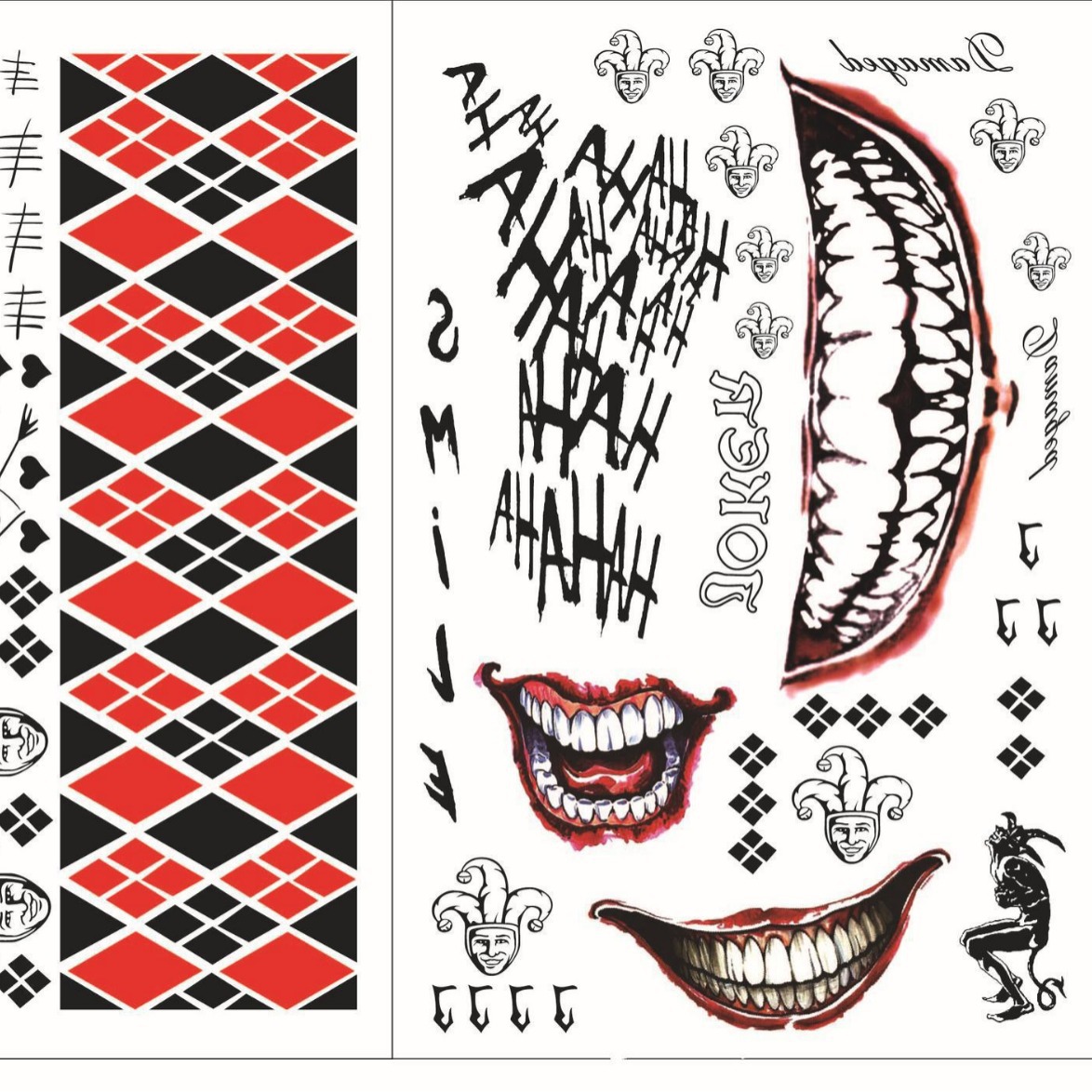 ハロウィーンx特派隊自殺チームの紋章には、醜い女性ハリー・クライン道化師のタトゥーシールが貼られている