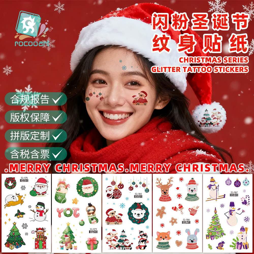 国境を越えた新作グリッタークリスマスフェイスステッカー 防水クリスマススノーフレークタトゥーステッカー 子供用漫画グリッターステッカー