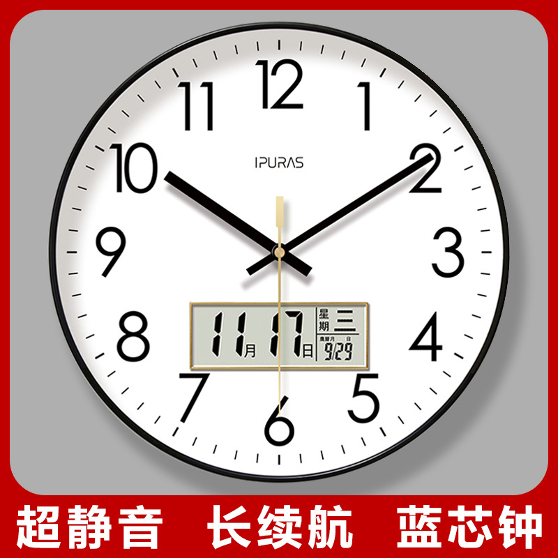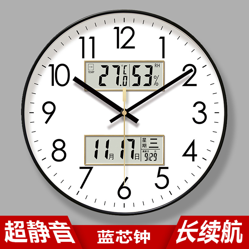 6026掛け時計リビングルーム液晶時計壁掛け時計掛け時計カレンダー万年暦クラシック静音スイーパー秒石英時計