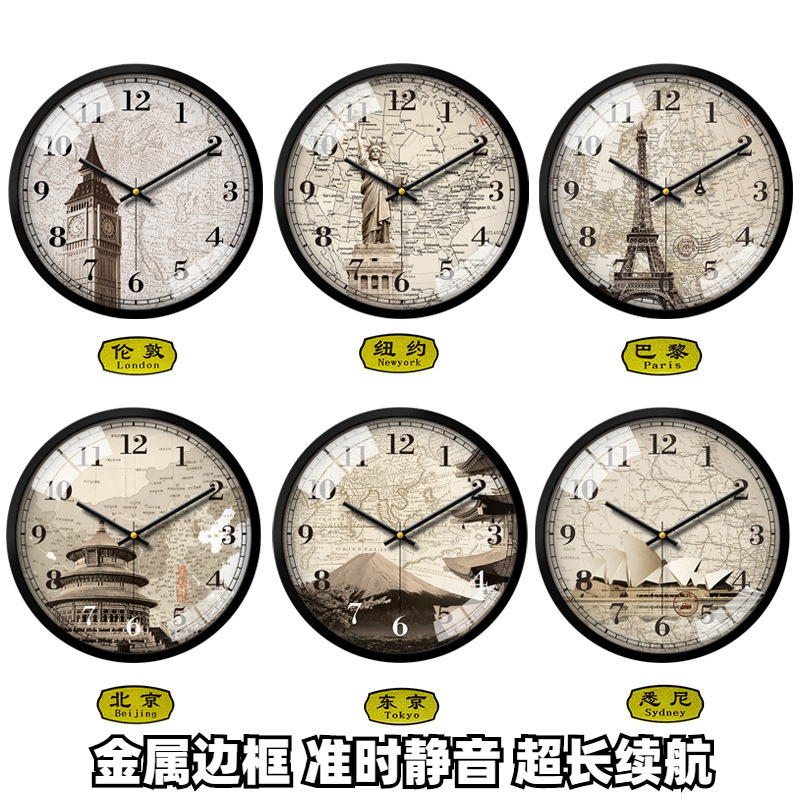 ホテルのホテルのロビーの前の世界の地名の時間帯のヨーロッパ式の復古の掛け時計の静音の現代のシンプルな時計