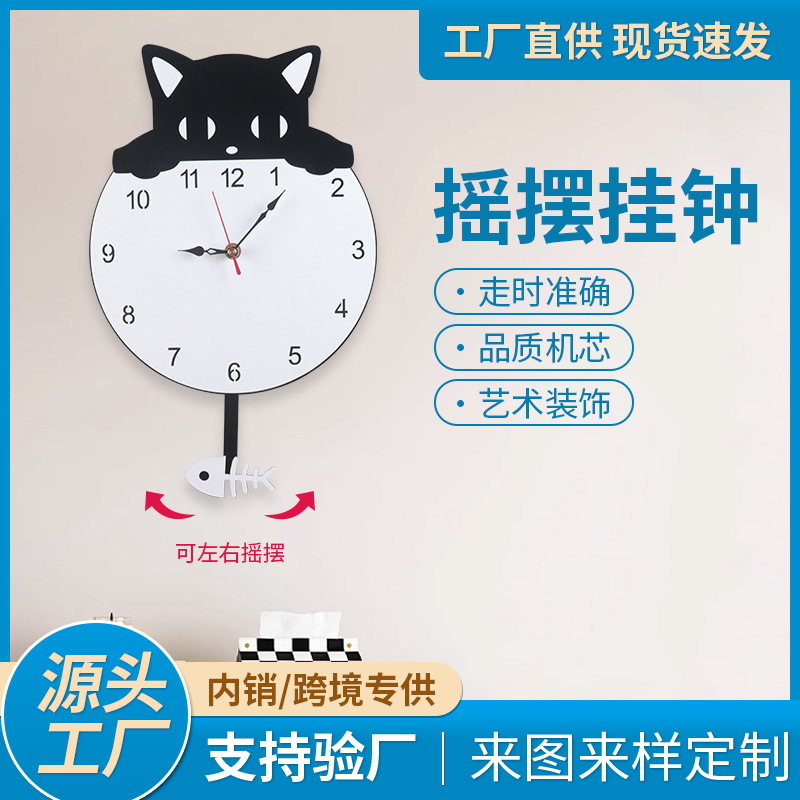 現代のクリエイティブアクリル猫魚スイング時計時計客間装飾石英時計ファッション静音掛け時計卸売り