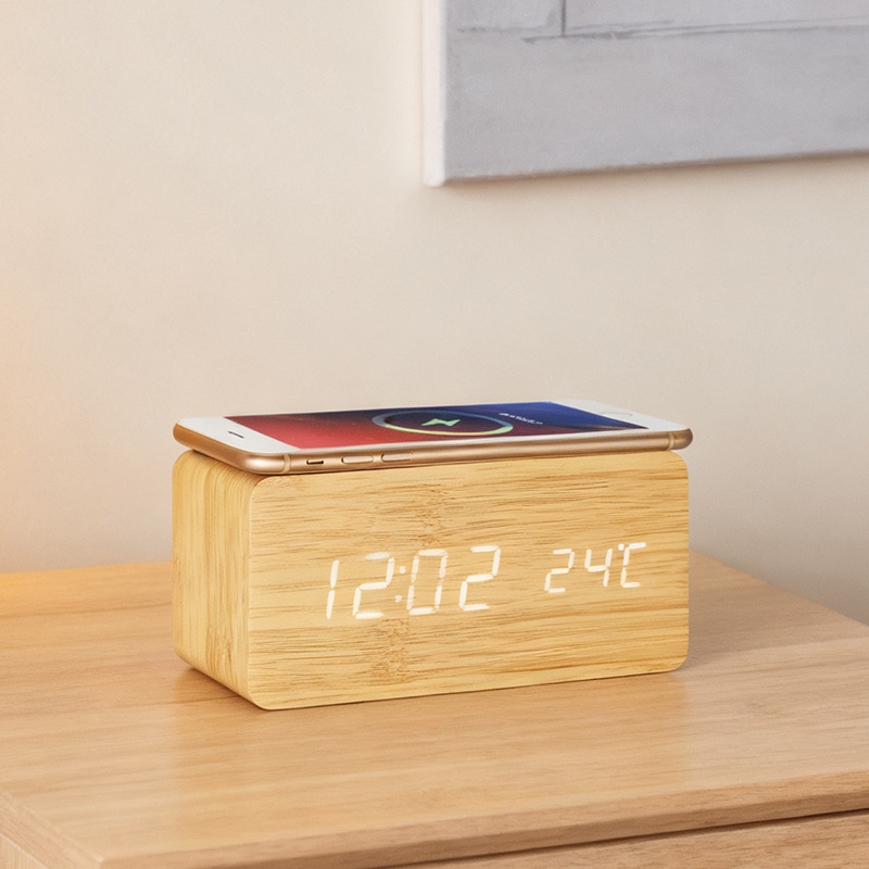 クリエイティブギフト携帯電話高速ワイヤレス充電木製時計シンプルなファッション静かな夜光LED電子目覚まし時計