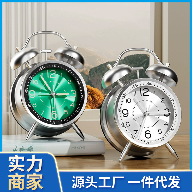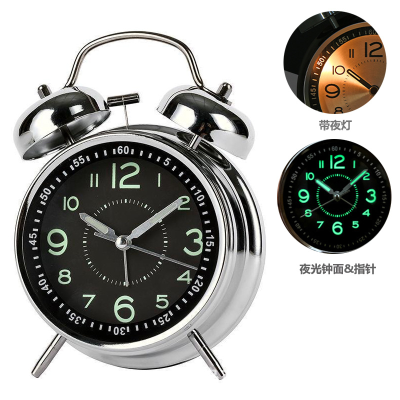 4インチメッキ銀色金属ベル目覚まし時計大目覚まし時計愛時達ブランド超静音ムーブメント夜灯付き