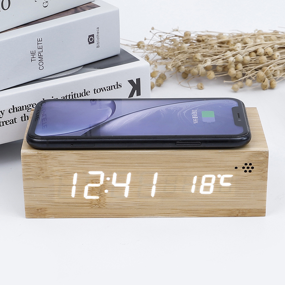 新型木製デジタル表示無線充電器目覚まし時計無線充電器デジタル表示音控時計メーカー卸売り