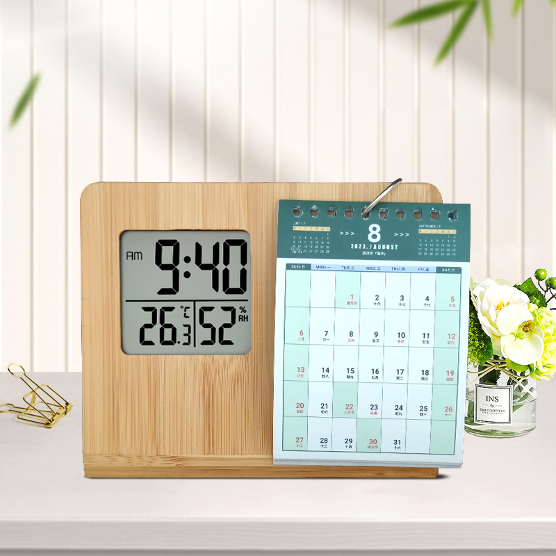 カレンダー温湿度竹木鐘カレンダー時間温湿度創意置物寝室書斎空調室の組み合わせ