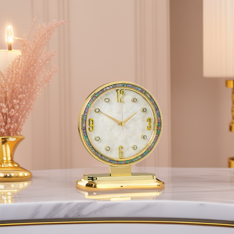 現代の軽豪華な高級貝殻家庭用置き時計シンプルなリビングルームの装飾時計大気テレビの棚には卓上時計が置かれています。