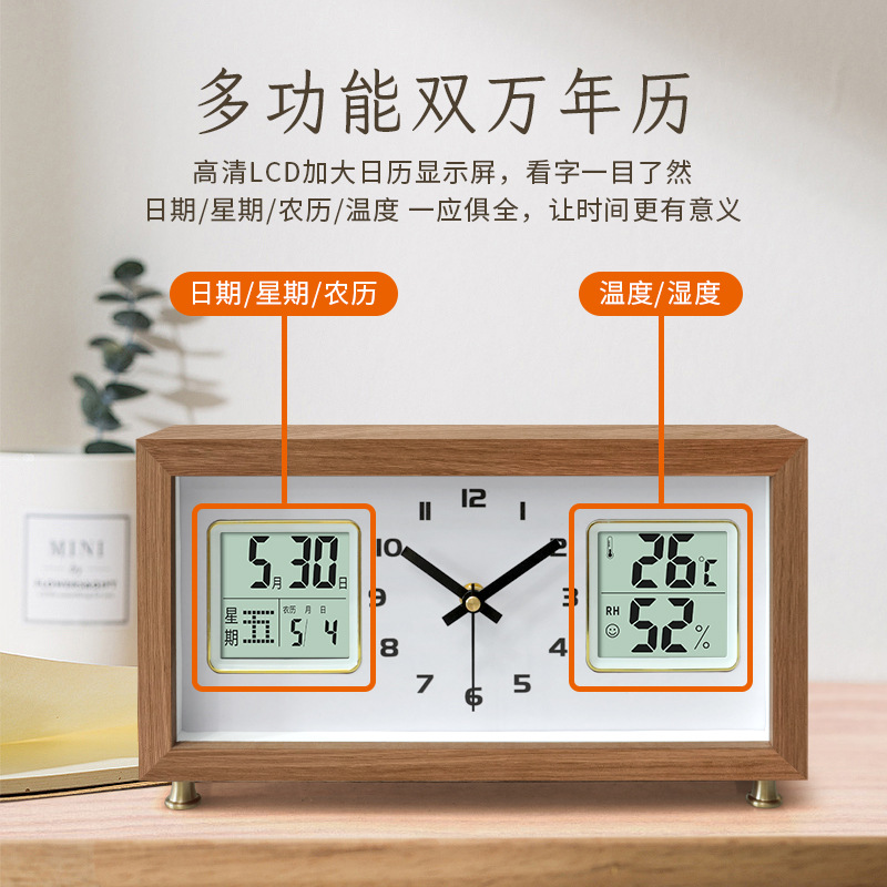 新しい中国風の無垢材レトロ卓上時計リビングルームデスクトップデスクトップ装飾品クルミ卓上時計サイレント永久カレンダークォーツ時計