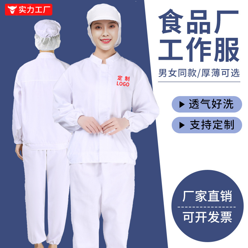 食品工場作業服セット男性白色工場服生産加工工場女性防塵服食堂工装刺繍印字